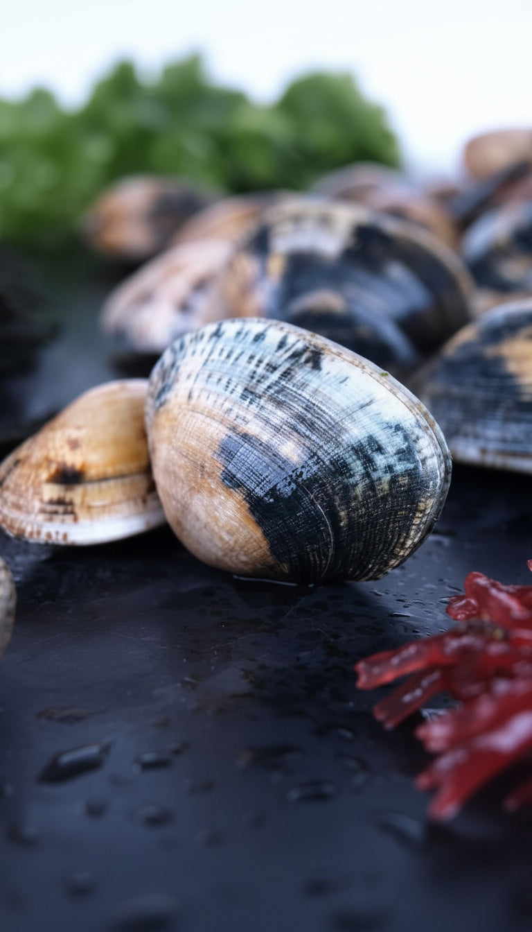 La almeja babosa se caracteriza por sus diferentes tonos grisáceos, blancos y marrones. Es con la almeja fina la variedad más valorada para la clásica receta de almejas “a la marinera”. De carne muy sabrosa y tierna.